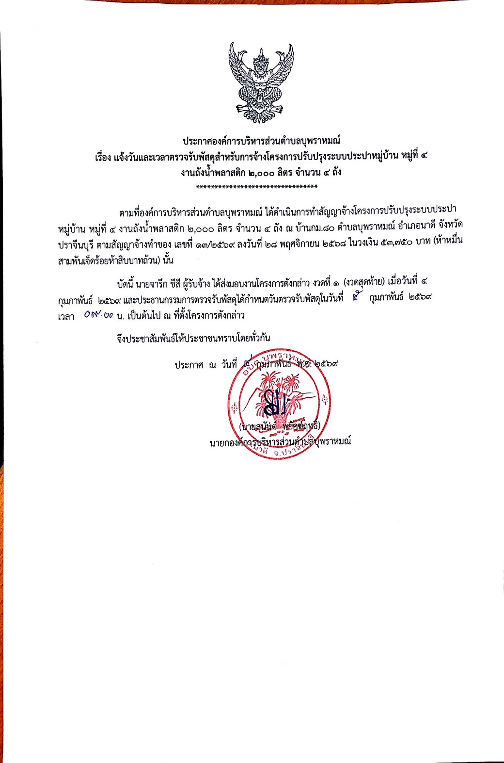 แจ้งวันและเวลาตรวจรับพัสดุสำหรับการจ้างโครงการปรับปรุงระบบประปาหมู่บ้าน หมู่ที่ 4 งานถังน้ำพลาสติก 2,000 ลิตร จำนวน 4 ถัง
